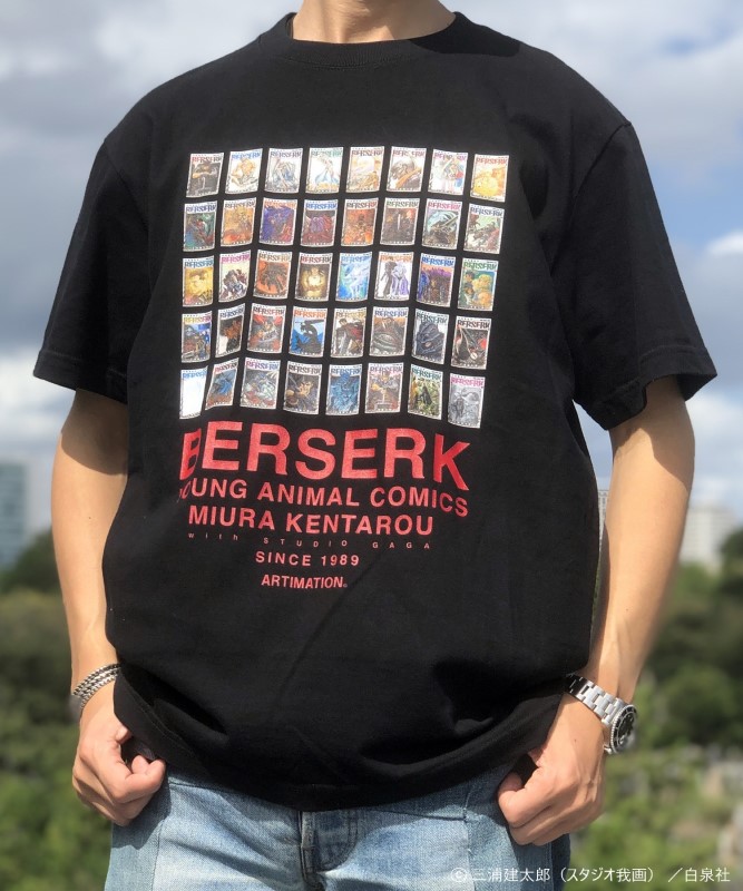 フロントに「ベルセルク」コミックのカバーを集約させたプリントTシャツ。
