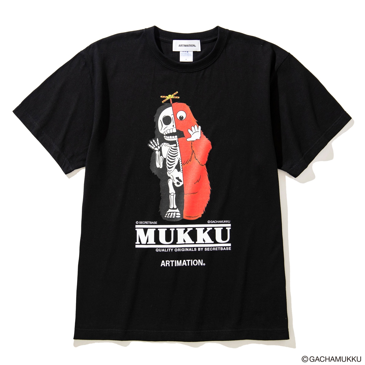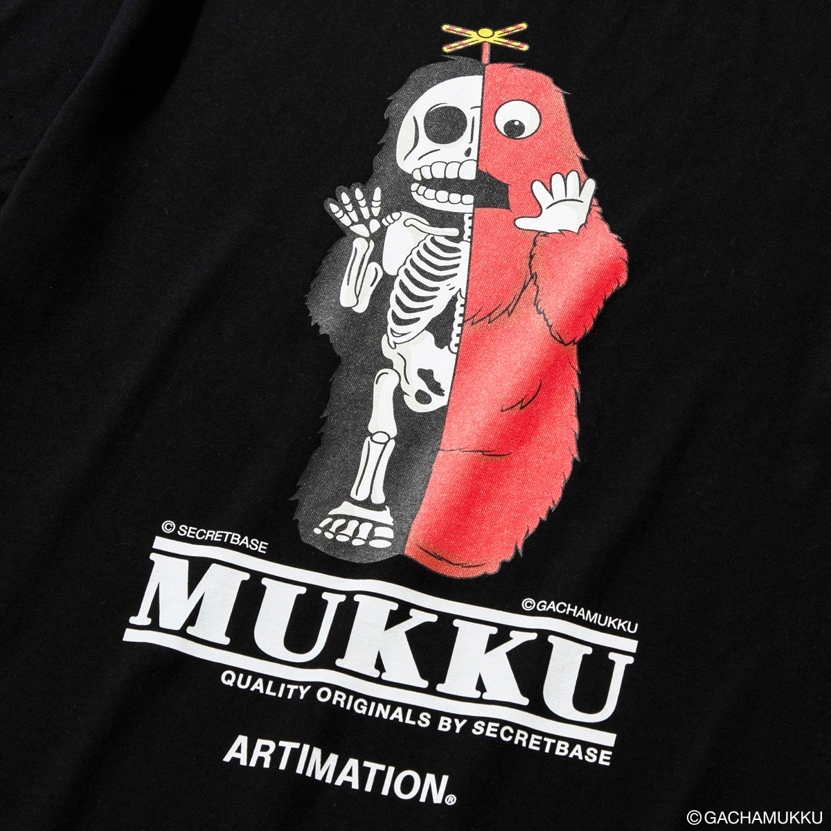ガチャピン・ムックの50周年を記念して、SECRET BASEによるARTIMATIONオリジナルデザインが完成。ムックが半分骸骨になったストリート性の高い一枚。