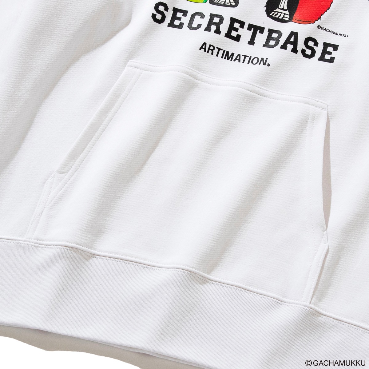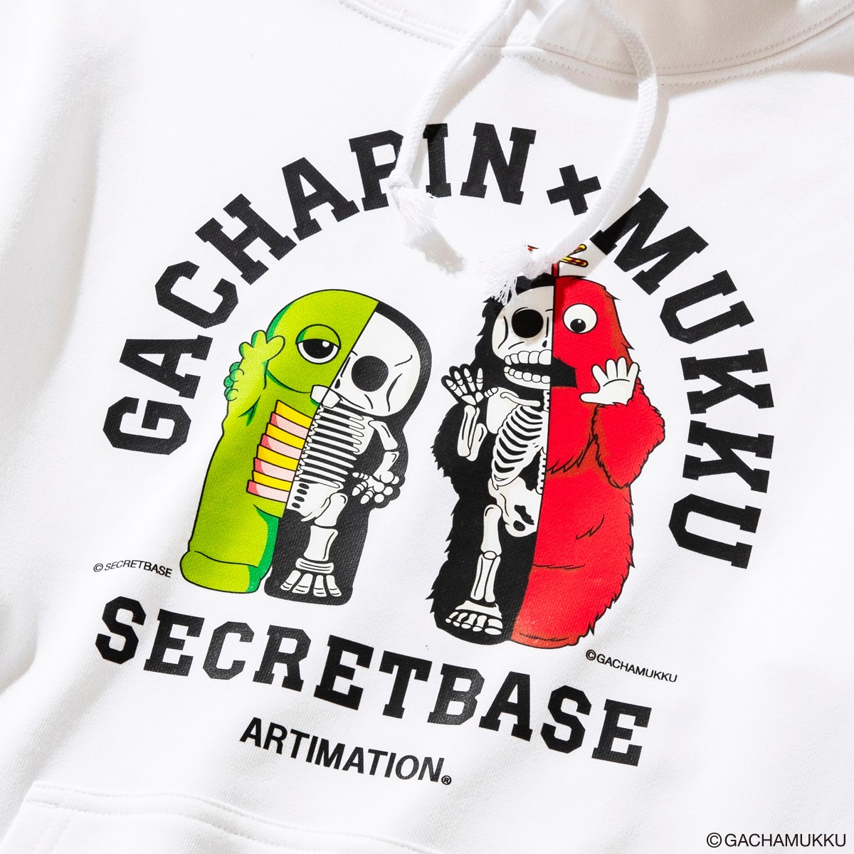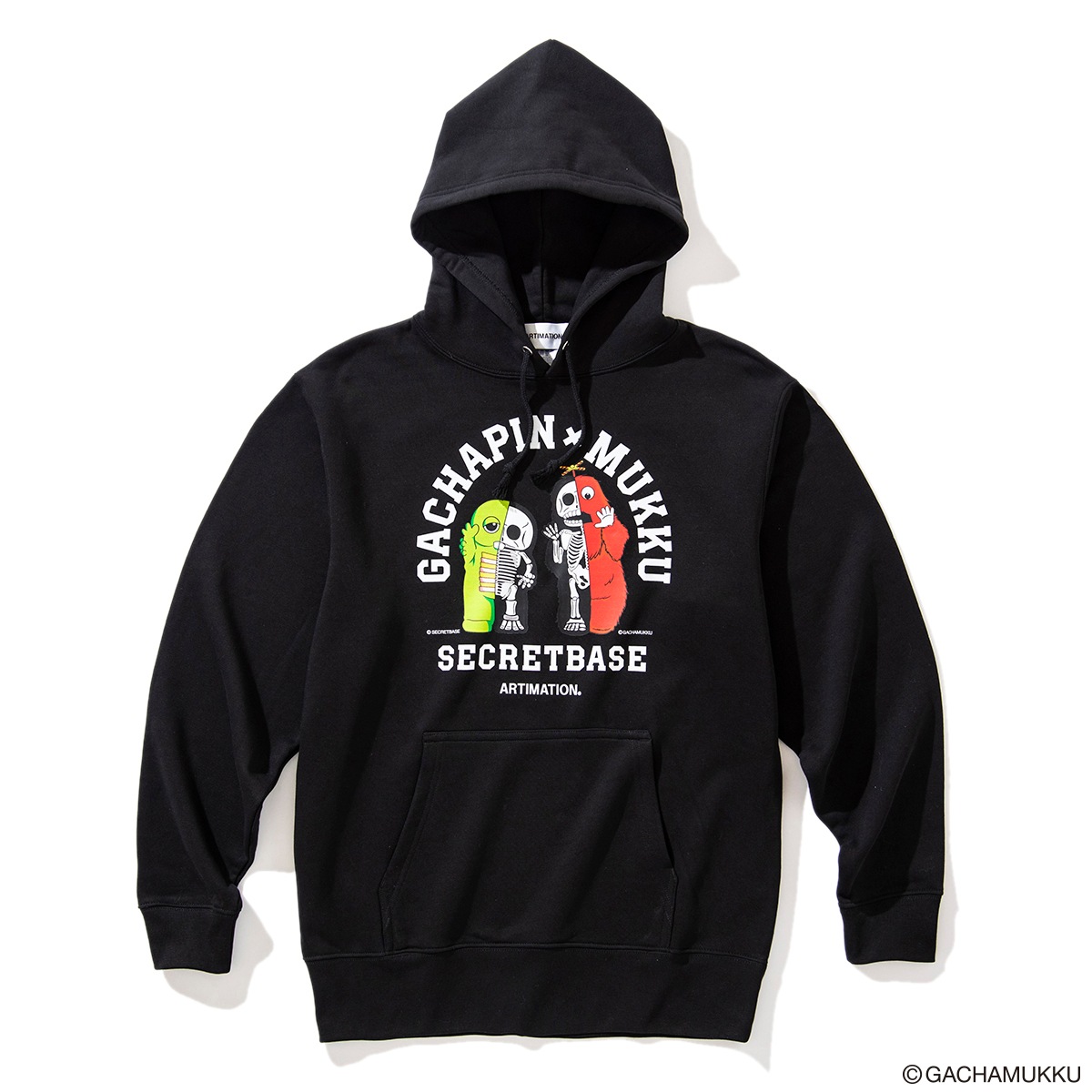 ガチャピン・ムックの50周年を記念して、SECRET BASEによるARTIMATIONオリジナルデザインが完成。ガチャピンとムックが半分骸骨になったストリート性の高いHOODIE。